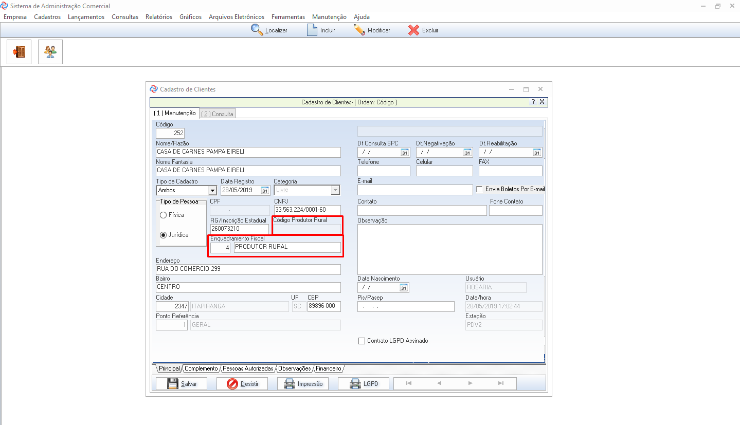 Abra a tela de cadastros e no cadastro do produtor localize o campo Código Produtor Rural para inserir o código e também Após isso Salve e siga para a próxima etapa.