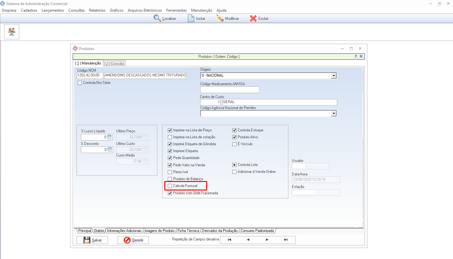 Acesse a tela de cadastros dos itens e localize o produto que será utilizado na emissão da contranota. Acesse a aba Outros, procure e marque a opção Calcula Funrural.