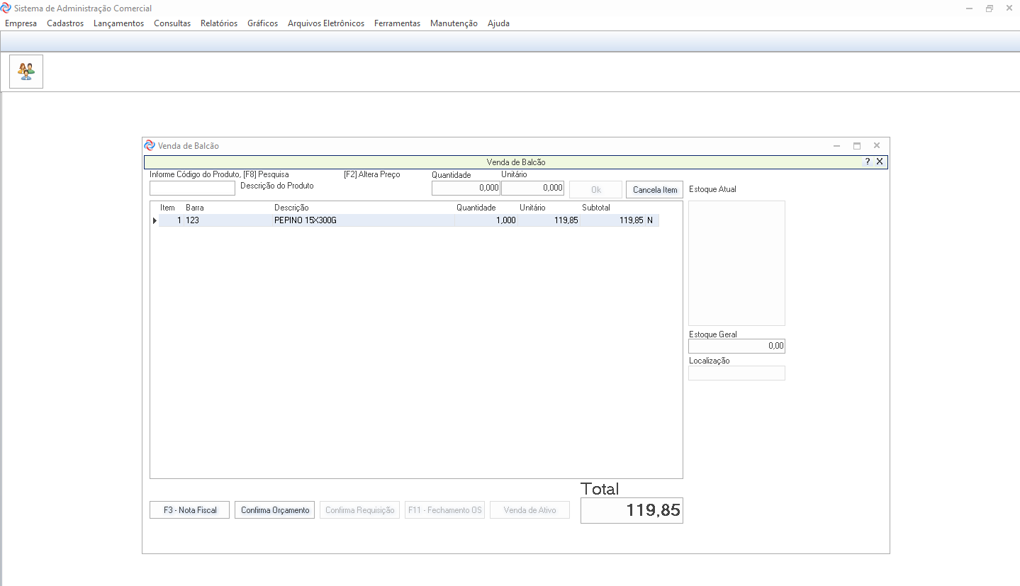 Lançamentos -> Vendas -> Venda de Balcão