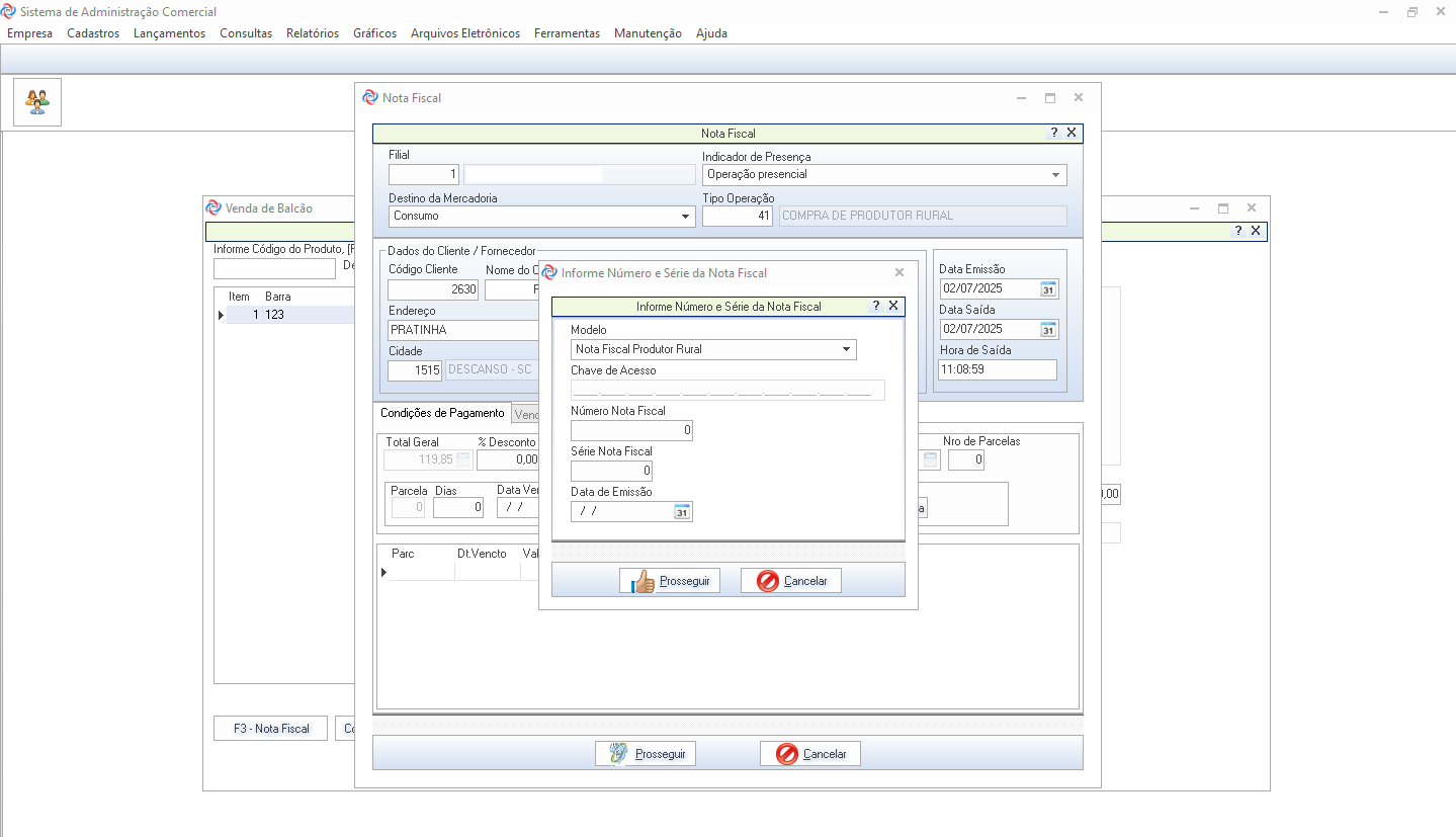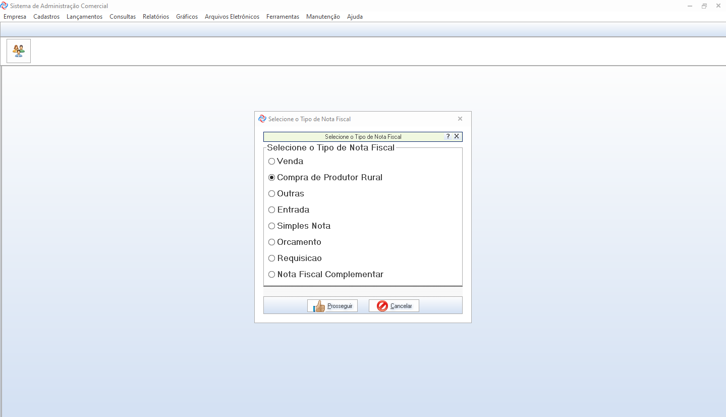 Na tela de Venda de Balcão selecione a opção Compra de Produtor Rural. Clique em Prosseguir para continuar.