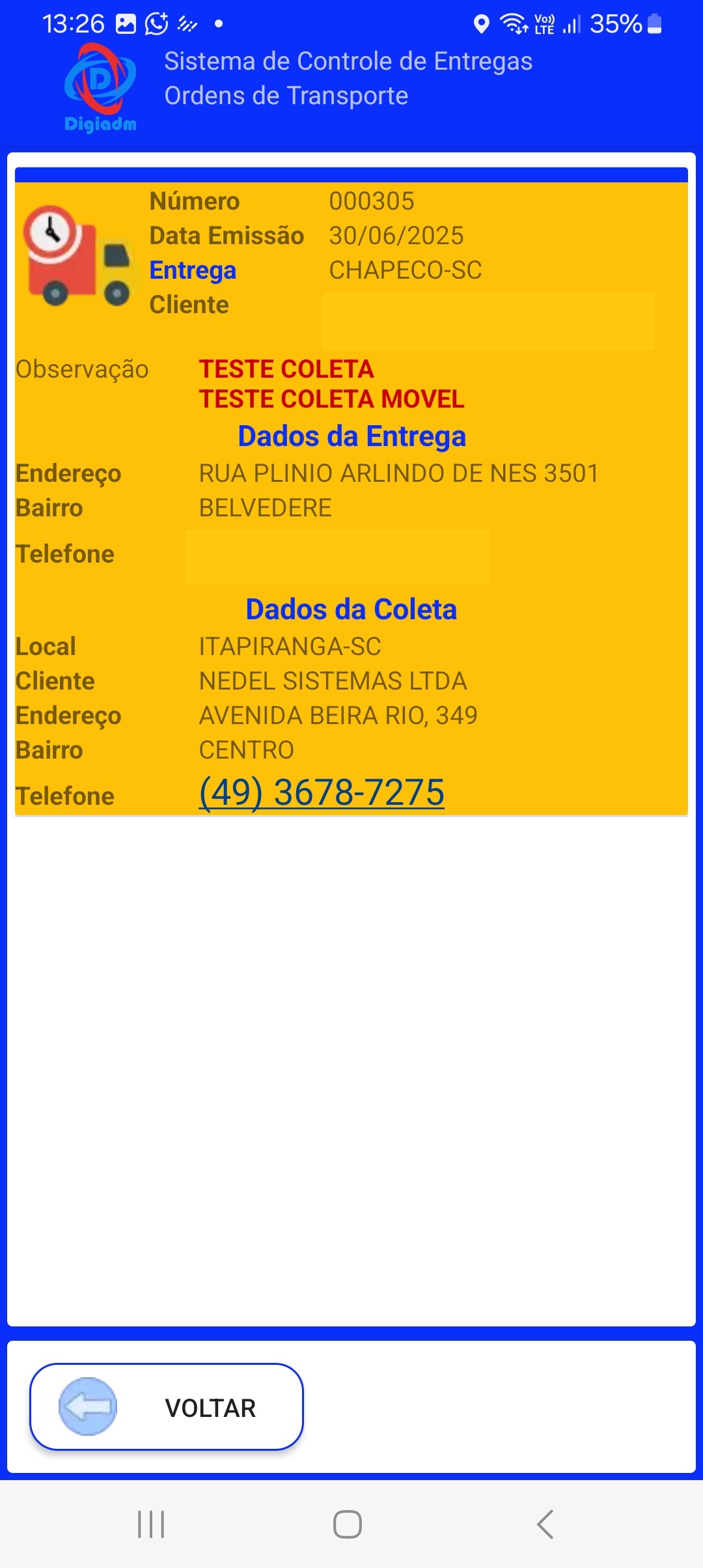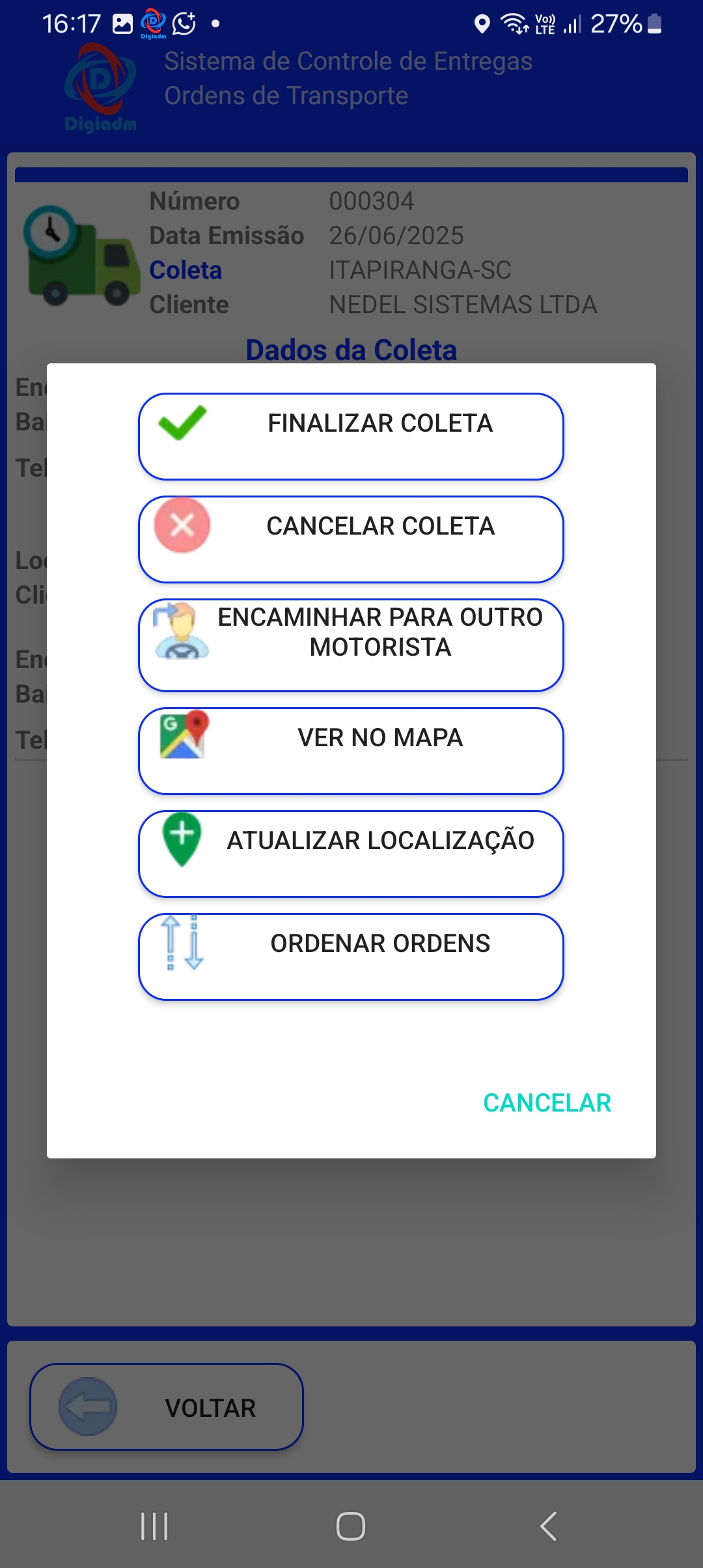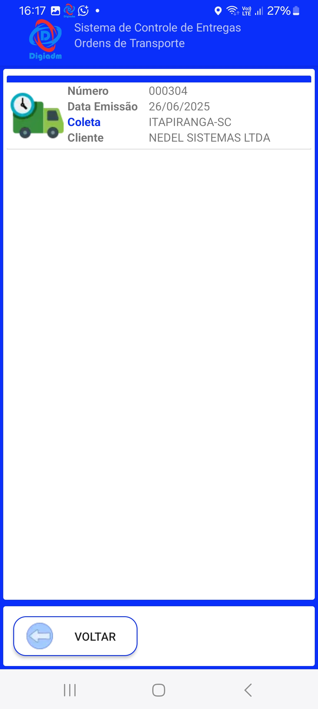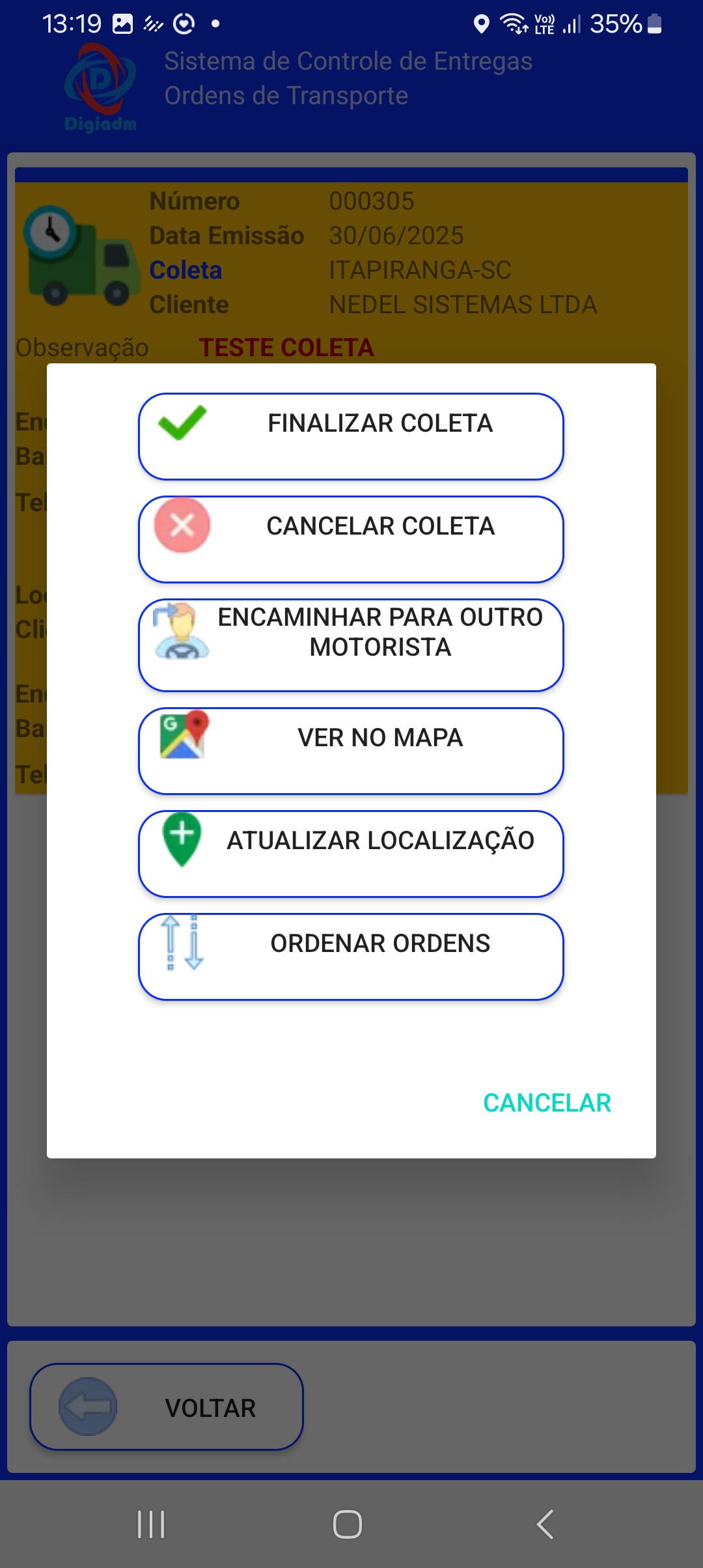 No aplicativo, a ordem ficará marcada como coletada e desaparecerá logo em seguida. O próximo passo deve ser feito através do aplicativo retaguarda.