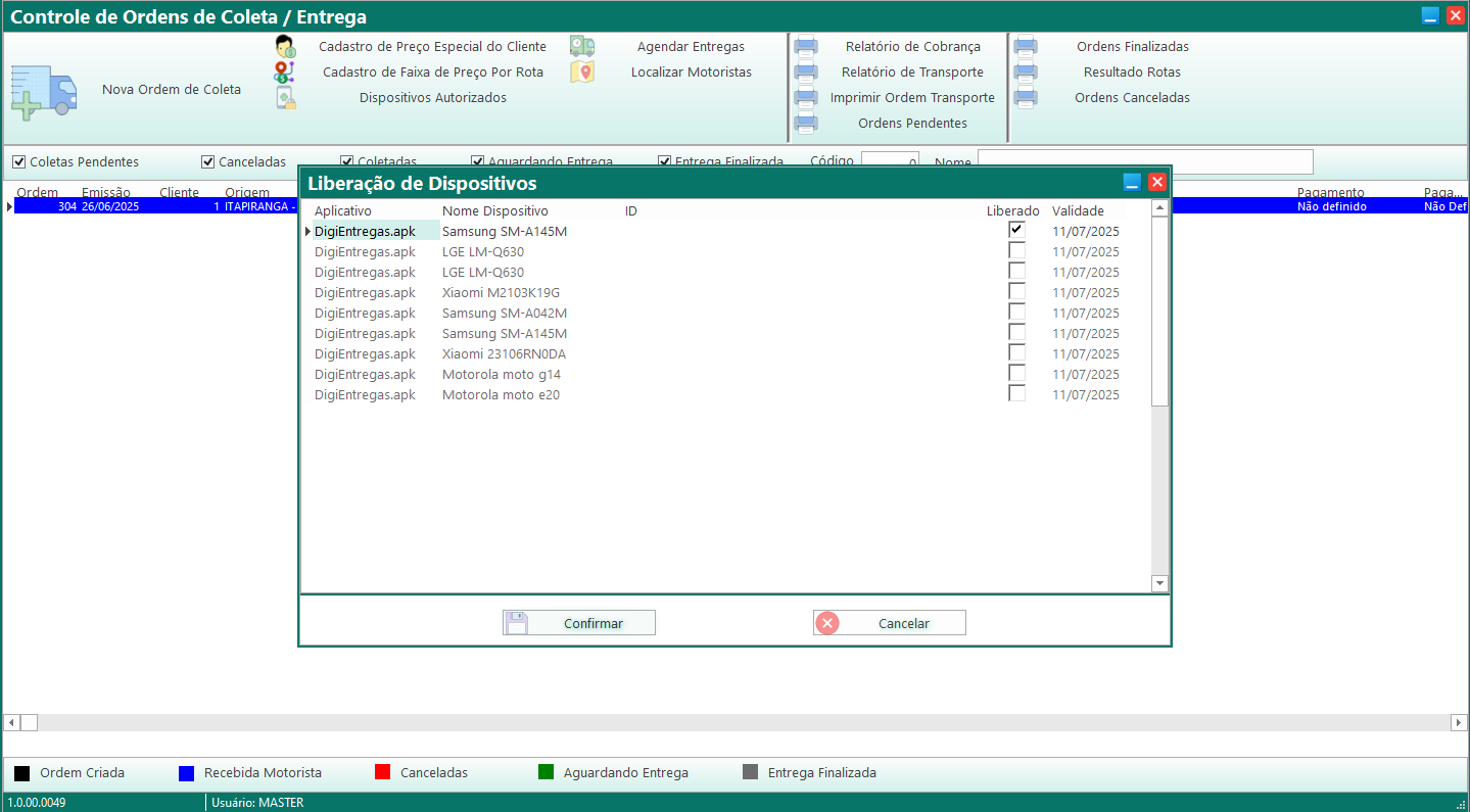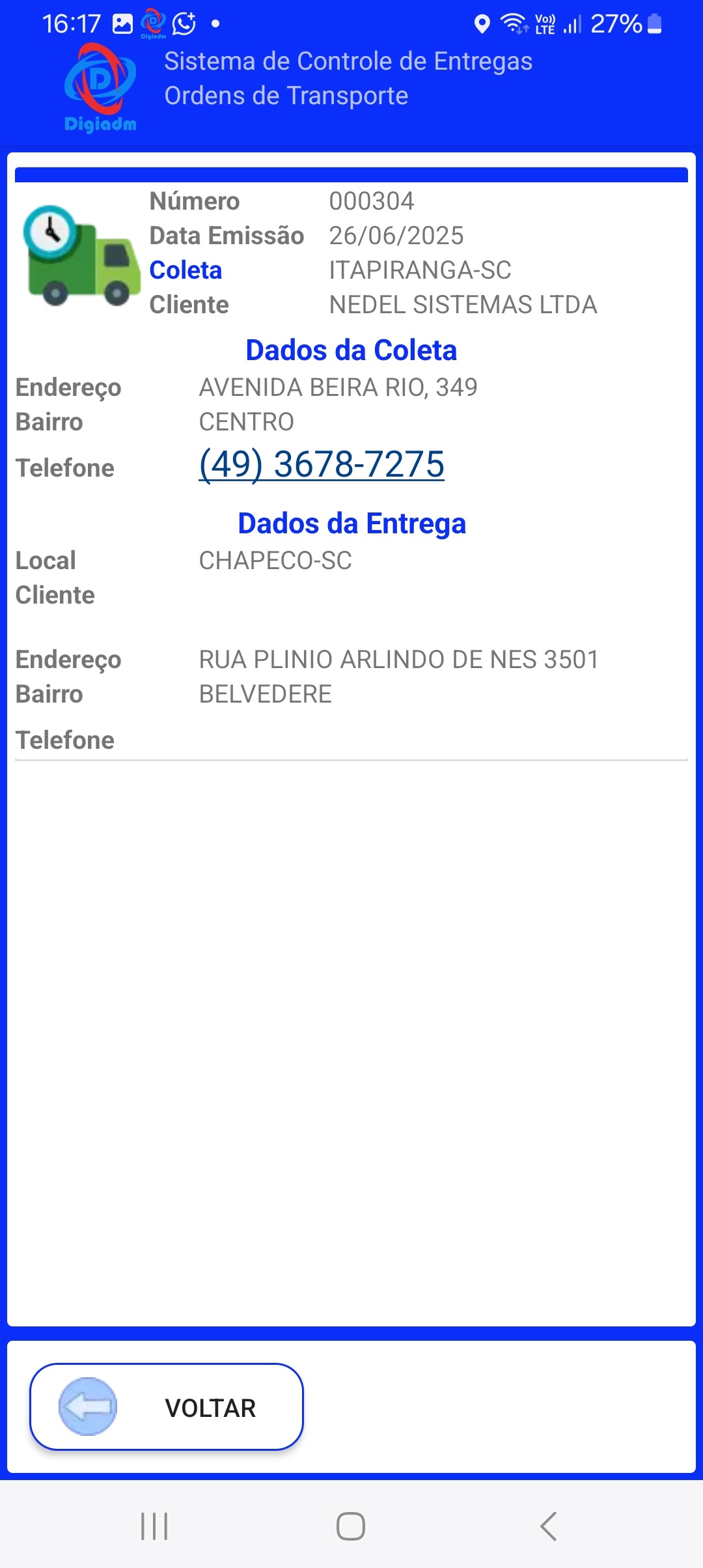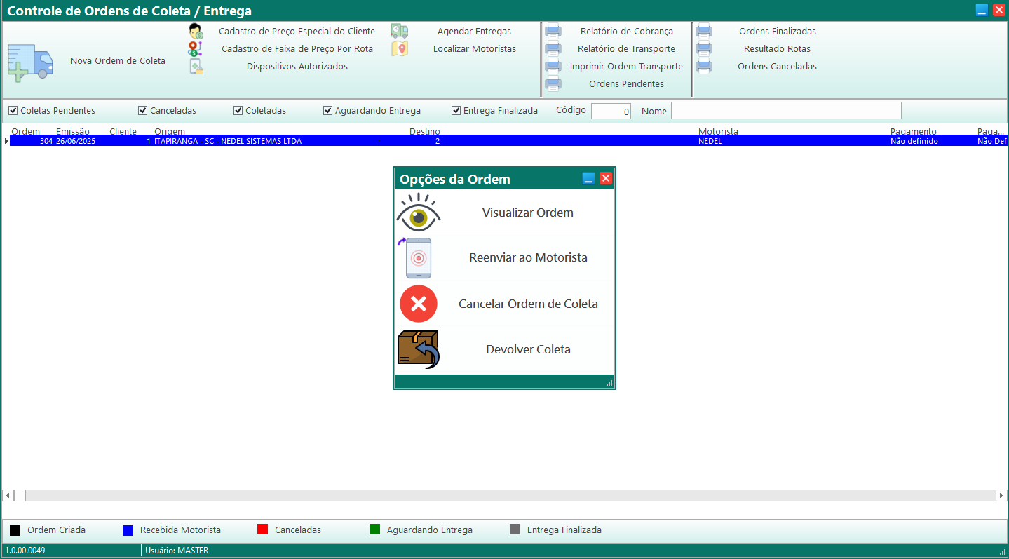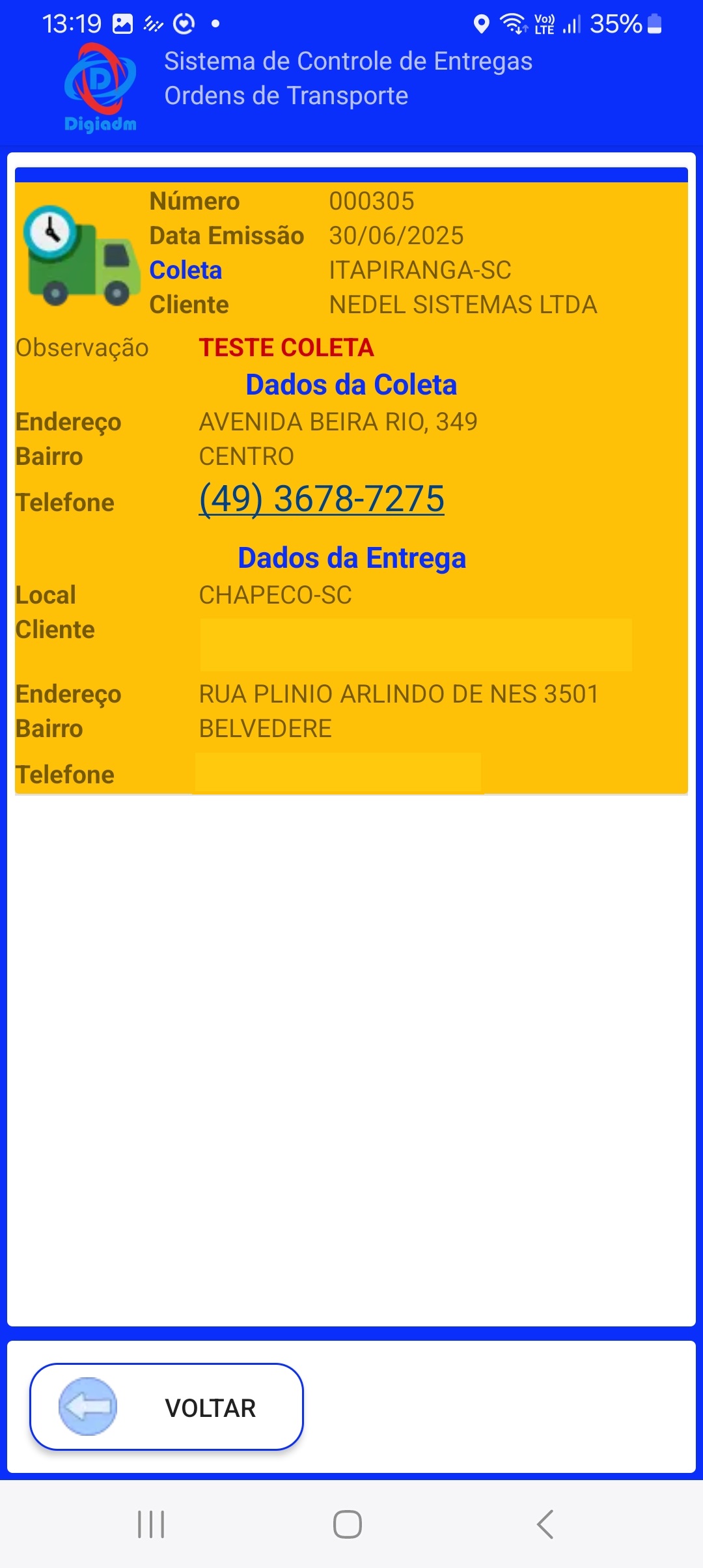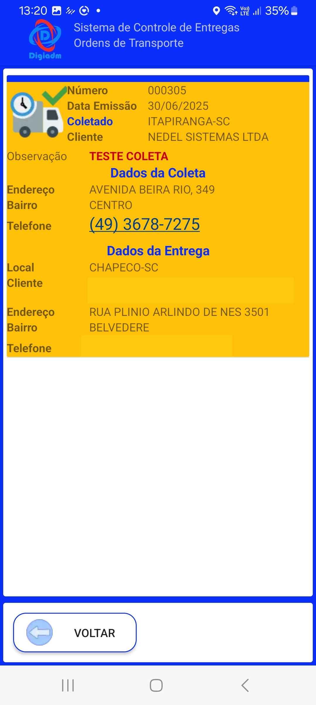 No aplicativo, a ordem ficará marcada como coletada e desaparecerá logo em seguida. O próximo passo deve ser feito através do aplicativo retaguarda.