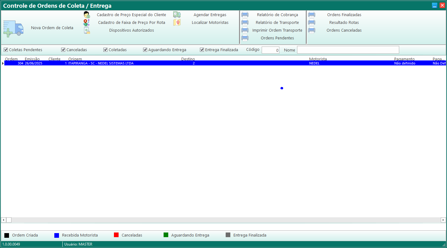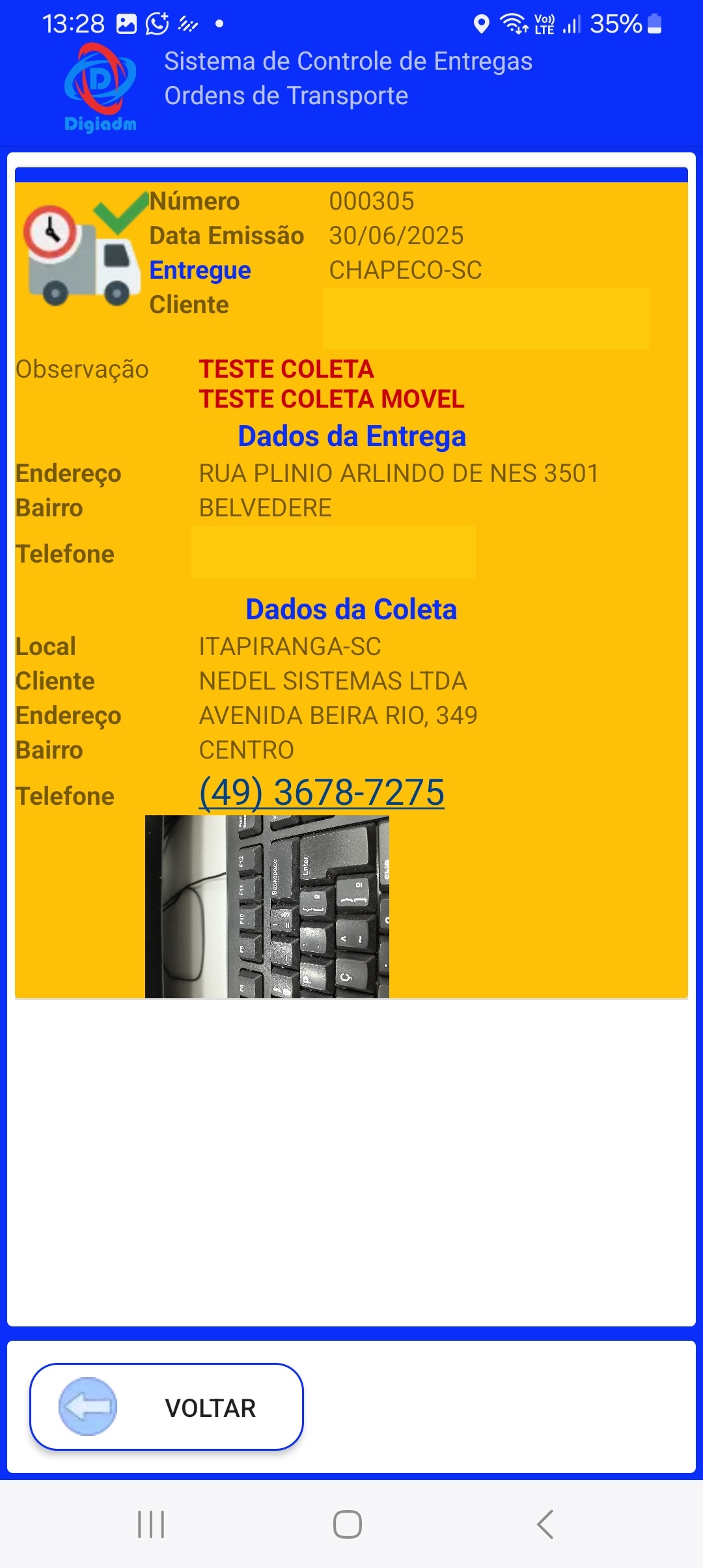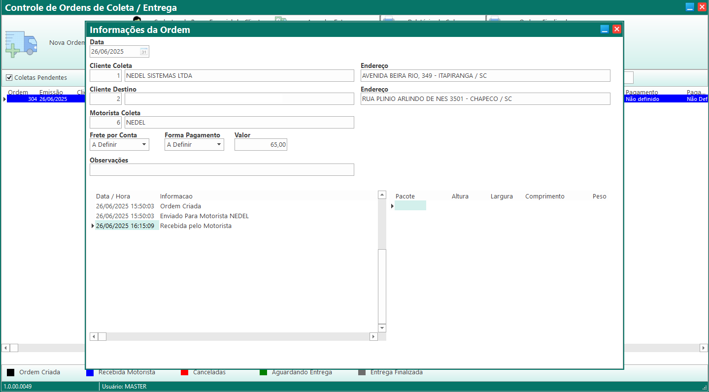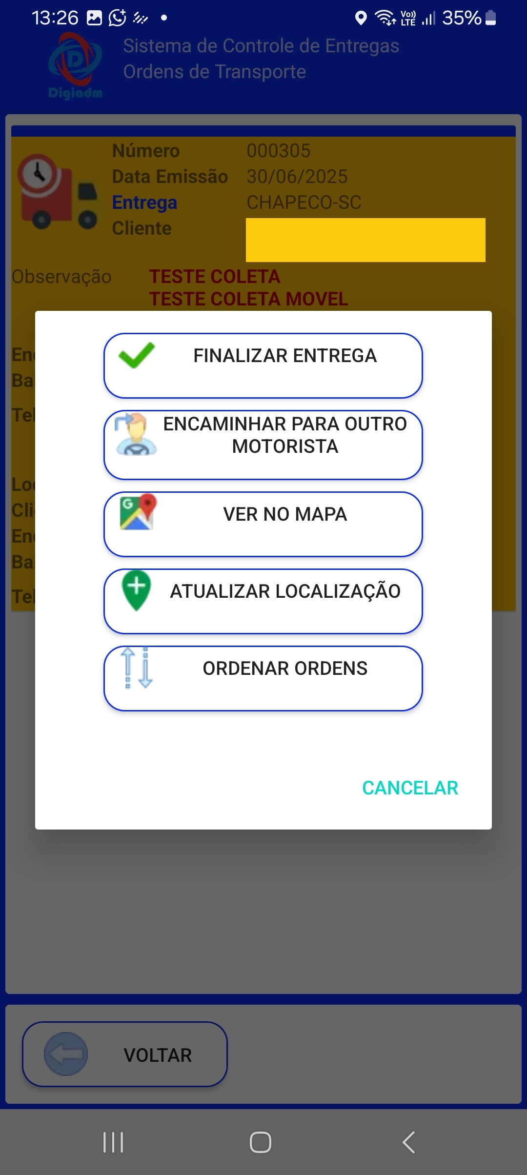 No aplicativo, a ordem ficará marcada como coletada e desaparecerá logo em seguida. O próximo passo deve ser feito através do aplicativo retaguarda.