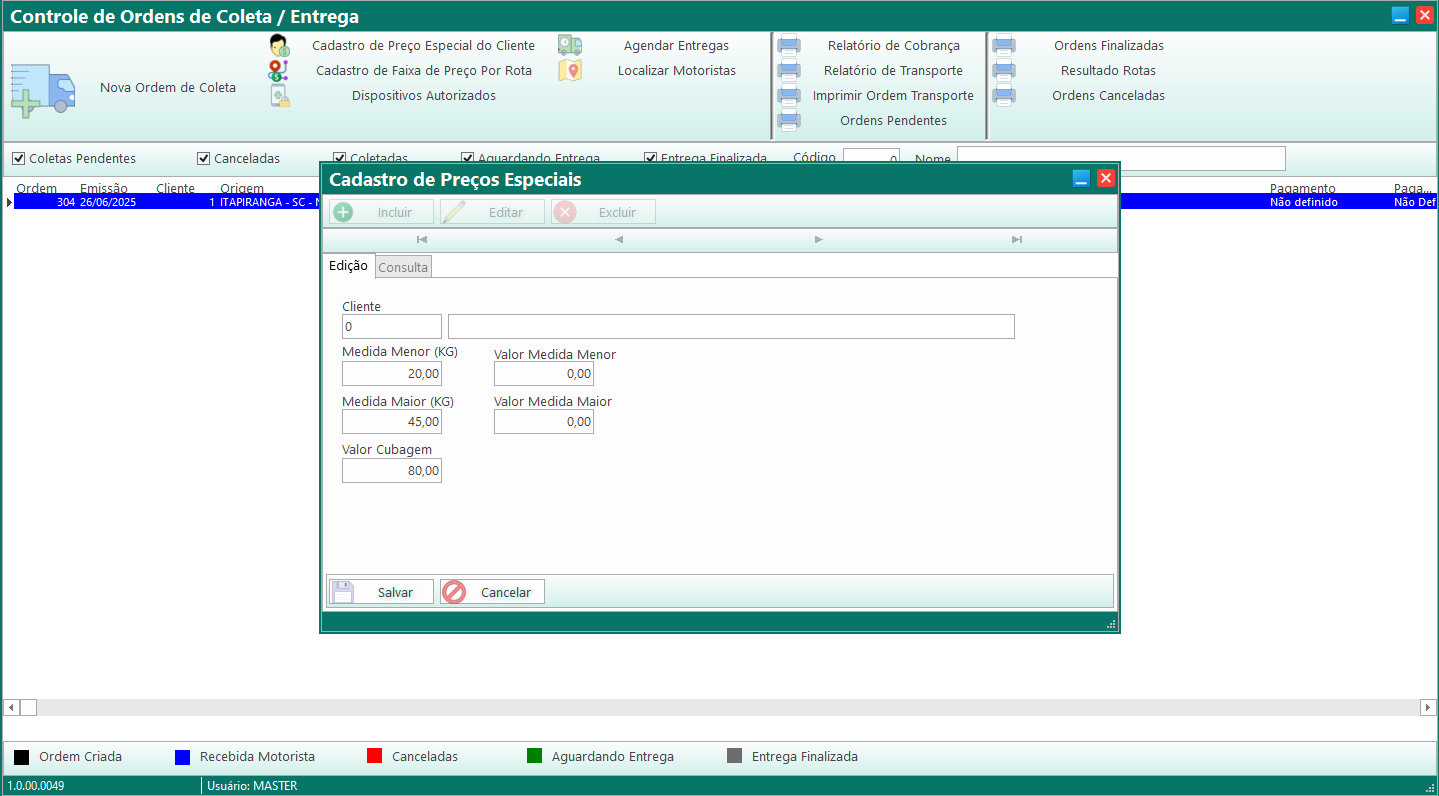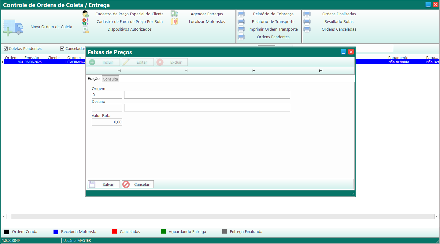 Também é possível definir uma faixa de preços para rotas, especificando a origem e o destino, dando a esta rota um valor fixo de frete.