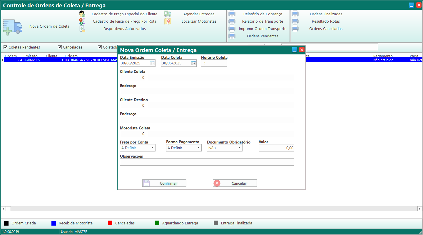 Informamos nesta tela todas as informações necessárias para abertura desta nova coleta.