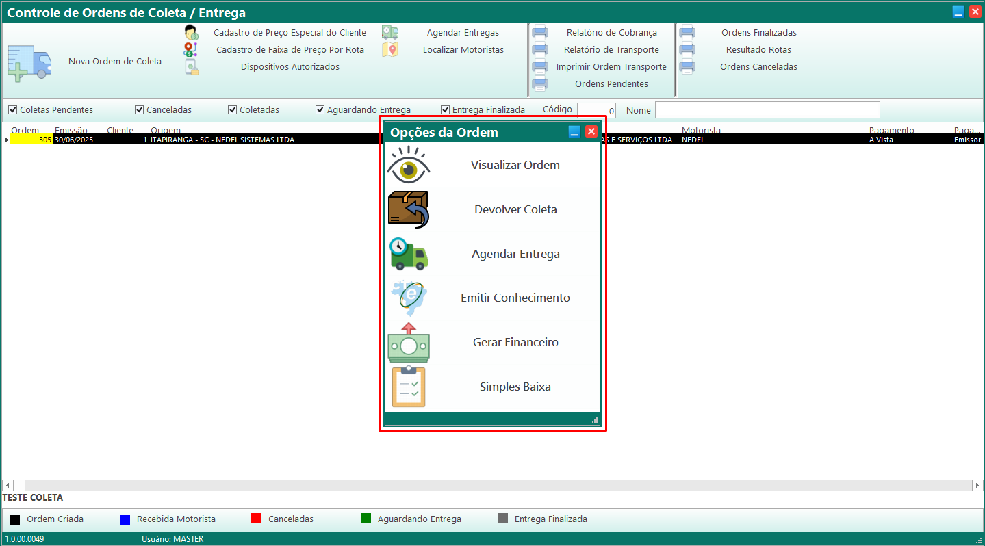 Efetuando dois cliques sobre uma ordem, será aberto um menu de opções: