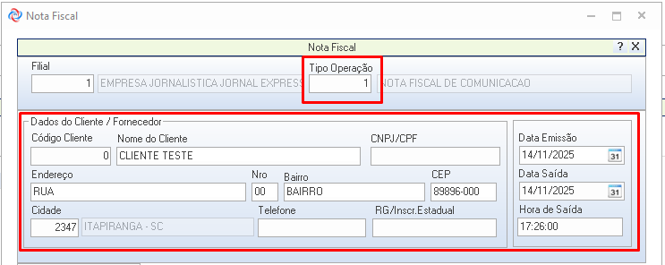 Preencha as informações como tipo de operação a ser utilizado e informações do cliente/fornecedor