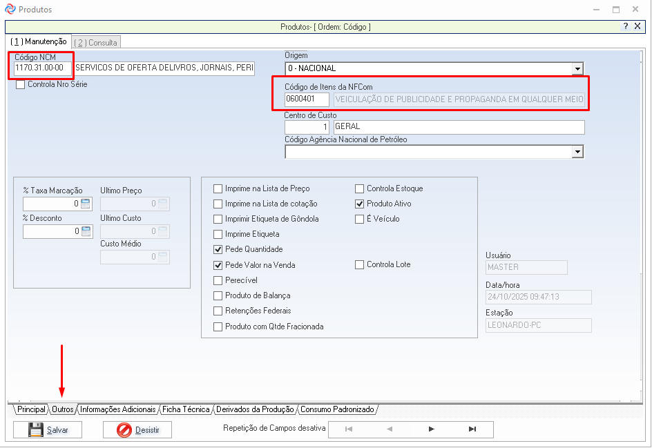 É necessário preencher o Código NCM e Código de Itens da NFCom para configuração correta. Em ambos os campos, é possível pressionar F8 para procurar os já cadastrados no sistema.
